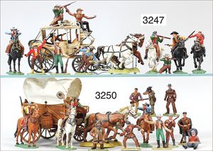 Konv. ELASTOLIN, Kunststoff-Figuren, 7,5 cm, Postkutsche mit 2 Zugpferden, dazu 5 Reiter, 8 Figuren stehend, kämpfend, Postkutschen-Räuber, Sheriff, Cowboys, meist sehr guter Zust.