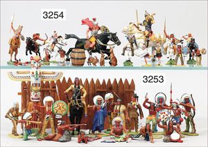 Konv. 27 Teile Indianer, stehend, kämpfend, Lagerleben, darunter 2 Figuren mit bewegl. Arm, 1 Figur bogenschiessend mit Zugarm, dazu Totempfahl, einige Holzpalisaden, fahrbare Wand beschädigt, sonst meist sehr guter Zust.