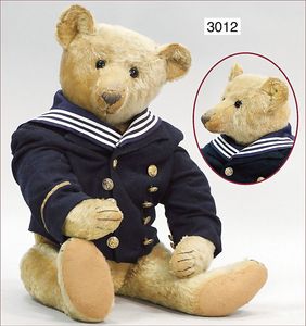 STEIFF Bär, Vorkrieg, ca. 1919, mit Schuhknopfaugen, Nasenspitze berieben, etwas ausgebessert, Buckel, lange, abgeknickte Arme, Filztatzen in gutem Zust., 61 cm, Seemannsjacke, ausgefallen