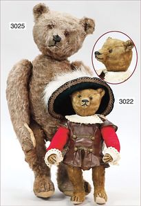 STEIFF Mittelkopfnaht-Bär mit Knopf, Schuhknopfaugen, Fehler an den Filztatzen, kl. Flickstellen, bis auf kl. Stellen Mohair in gutem Zust., an den Tatzen stark ausgegangen, bekleidet, 40 cm Stehhöhe, abgeriebene Nasenspitze, Rumpf fest gestopft