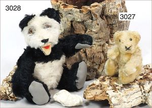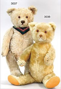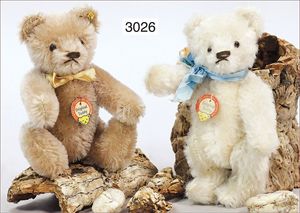 STEIFF Konv. 2 Orig.-Bären, 1 x weißes Mohair, mit Brustschild, 14 cm, guter Zust., 1 Bär mit Knopf, Schild und Reste der gelben Fahne, 14 cm, caramellfarben
