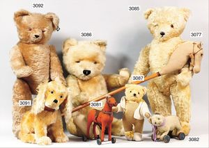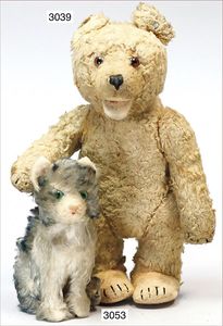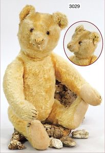 Bär wohl SONNEBERG, schw. Nasenbestickung, Glasaugen, 83 cm, leicht abgeknickte Arme, etw. verstaubt, maisfarben, minimale Fehler an den Filztatzen, sonst guter Zust.