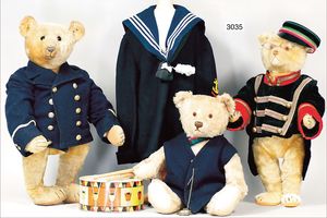 Kleidung für Steiff-Bären oder Puppen, mit Trommel, dazu 1 Jackett mit goldenen Knöpfen, Berliner Erzeugnis, passend mit kl. Taschenuhr, 1 Marine-Pullover, Bleyles Knabenanzug 128, dazu kl. Mütze, farbl. Passend, (Bären werden separat versteigert)
