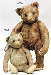 STEIFF Bär, ca. 1910, mit Knopf, langgezogenes F, Schuhknopfaugen, karamellfarben, Filztatzen bis auf kl. Stellen in gutem Zust., 1 Filztatze am linken Fuß teilw. etw. ausgebessert, 31 cm, lange, abgeknickte Arme, Buckel, sehr schöner Ausdruck, sehr guter Zust.