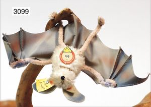 STEIFF Eric, Fledermaus, mit Knopf, Schild und Fahne, Nr. auf der Fahne 1310,80, 10 cm, unbespielt