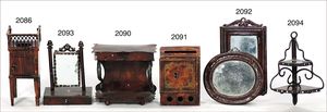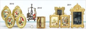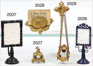 ERHARD & SÖHNE Konv. für herrschaftl. Puppenstube, 1 filigran ausgearbeiteter Spiegel, 11,5 cm, ausgefallen, dazu 1 Spiegel, 6 cm, 2 Bilderrahmen mit lithogr. Bildern, 6 cm