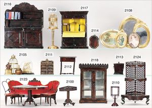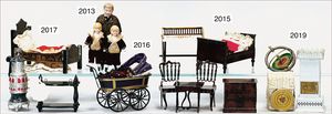 ROCK & GRANER Schlafzimmerprogramm, Bett, 11 cm x 6,5 cm, 2 Stühle, Höhe 8 cm, 1 Nähtisch, aufklappbar, Höhe 5,5 cm, Kommode, Höhe 6 cm, Breite 6,5 cm, Wickeltisch mit floral gearbeiteter Porzellan-Platte, Höhe 8 cm, Breite 8,5 cm, ausgefallen