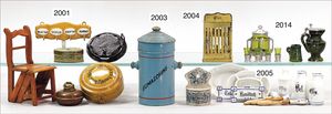 Küchenzubehör, Handtuchhalter mit 4 Haken,11 cm,1 Brotdose "Unser tägl. Brod gib uns heute", Durchm. 8 cm, Wärmflasche, Durchm. 3,5 cm, Waffeleisen, Klappstuhl, ausklappbar zur Leiter, Holz, 13 cm hoch, kl. Blech-Dose lithogr., 2 cm