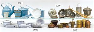 Ausschmückungsteile für große Puppenküche, Wasserkessel, Höhe 10 cm, Topf, Höhe 7 cm, Durchm. 8,5 cm, Pfanne, 2 Kellen, 2 Eimer, Topf-Pfanne, 1 Pfanne, blau handlackiert