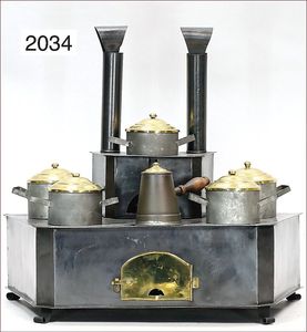 ROCK & GRANER Biberacher Blech, außergew. Puppenküchen-Herd, 49 cm breit, 44 cm hoch, 29 cm tief, 2 Schornsteine, 4 Töpfe, Kakao-Kocher, Wassertopf mit Ablasshahn, oben liegend, mit separatem Brenner, ca. 1860, museal, schöne Dekoration auch für eine große, frühe Biedermeier-Puppe