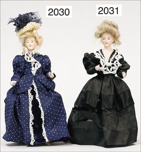 Konv. 2 Puppenstuben-Puppen, 1 x Typ Alice, Biskuitporzellan-Brustblattkopf, ausmodellierte Haare, aufgemalter Haarreif, blaue gemalte Augen, Biskuit-Unterarme und -Beine, Stoffkörper, 9 cm, alte Kleidung, Puppe mit herrschaftl. Mantel, 1 x Porzellan-Puppenstuben-Puppe, ausmodellierte blonde Haare, gemalte Augen, Biskuit-Unterarme und -Beine, Stoffkörper, Kleidung aus alten Stoffen genäht