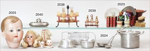Konv. Puppenküchen-Zubehör, Aluminium, 1 Teller, Backformen, Schüsseln, Reibe, Besteck-Kelle, Geschirr-Kelle, Durchm. ca. 4 cm - 6,5 cm