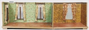 ROCK & GRANER 2-teilige Puppenstube, 1,19 m breit, seitl. Anbau, später einmal ergänzt, größeres Zimmer mit 3 Blech-Fenstern, aufgemalte Blei-Verglasung, Orig.-Vorhang, Blenden, 2-flüglige Ausgangstür, seitl. Raum dem Alter entsprechend passend, jedoch nicht von ROCK & GRANER, alte Tapete