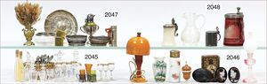 Konv. teils ausgef. Glasteile, 3,5 cm - 5 cm, Kelche, Karaffen, Gläser, 1 Korb, einige Zinn-Löffel, Tassen, Zinn/Glas montiert