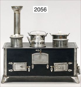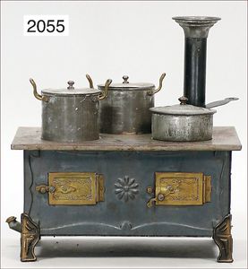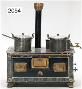 Puppenküchenherd, ca. 1910, 30 cm breit, 30 cm hoch, Original-Schornstein, Wasserschiff, 2 Töpfe, Wasserkessel, Topf, 1 Porzellangriff durch Schraube ergänzt, 2 Orig.-Brenner