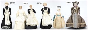 Konv. 2 Biskuitporzellan-Brustblattkopf-Puppenstuben-Puppen, 1 x blonde Hochsteckfrisur, gemalte Augen, Biskuit-Unterarme und -Beine, Stoffkörper, 12 cm, Kleidung aus altem Nesselstoff, 1 x Haushälterin, Biskuitporzellan-Brustblattkopf, Hochsteckfrisur, blaue gemalte Augen, Biskuit-Unterarme, 1 Arm fehlt, Biskuit-Beine mit anmodellierten Schuhen, 13 cm, alte Kleidung