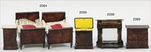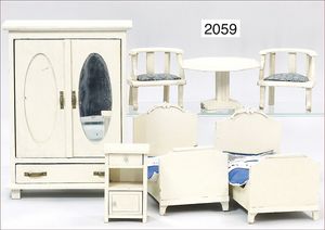 Puppenstuben-Schlafzimmer-Möbelprogramm, ca. 1910, Kleiderschrank 24 cm hoch, 2 Türen, Schublade, dazu passend 2 Betten, Nachttisch, kl. Sitzgruppe