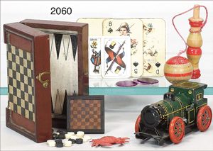 Konv. für gr. Puppenstube, mehrere Quartette, kl. Penny Toy Lokomobil, 1 Brettspiel umbaubar für Dame und Backgammon, 1 Holzspiel mit Ball, schönes Konv.