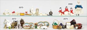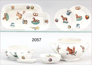 außergew. Puppengeschirr, gemarkt Max Roesler Maske, Puppenmotiv mit Früchten, Suppenterrinen, Höhe 7,5 cm und 4,5 cm, Deckel fehlen, Sauciere, mehrere Anbietschalen, 5 Teller Durchm. 9,5 cm, 3 Teller Durchm. 10 cm, 4 Teller Durchm. 8 cm, kl. Stellen bestoßen, sonst gut
