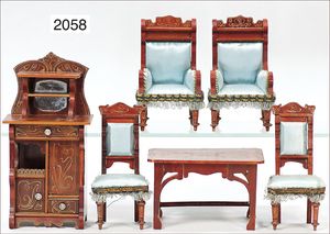 Wohnzimmer-Möbelprogramm, Jugendstil, Schrankhöhe 21,5 cm, 2 Armsessel, 2 Stühle, Tisch, lithogr. Dekor, Samtbezug, sehr guter Zust.