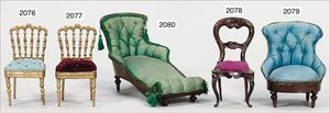 ROCK & GRANER, Biberacher Blech Stuhl, gold bemalt, gepolstert, mit hellblauer Seide, bestickt mit kl. Goldperlen, 9 cm hoch, selten