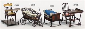 ROCK & GRANER, Biberacher Blech Kinderhochstuhl, auf fahrbarer Platte, filigran gearbeitet, untersch. Farbbemalung, 10 cm hoch, 8 cm breit, unbespielt, selten
