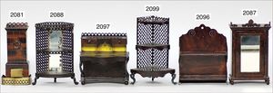 Konv. 3 Teile, Zinn-Ofen, 12,5 cm, Boule-Bett, Länge 12,5 cm, Höhe 11 cm, Vorderteil lose beiliegend, Holz-Hängeregal, Breite 7 cm