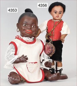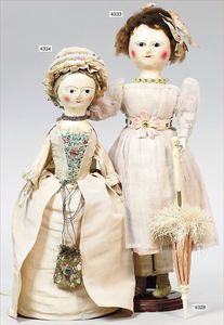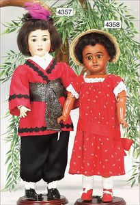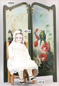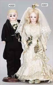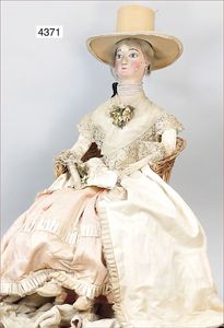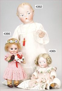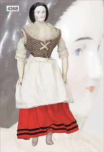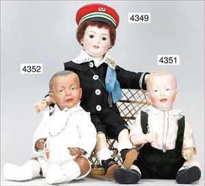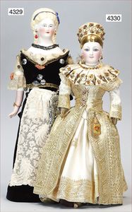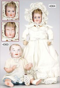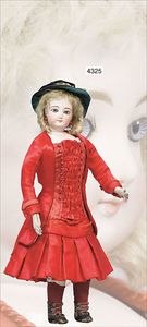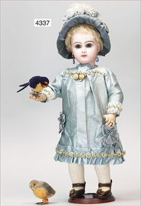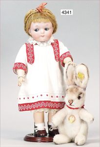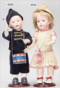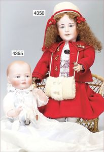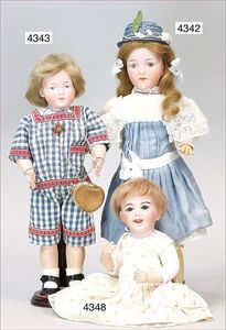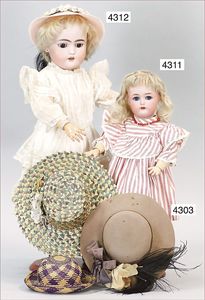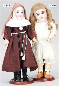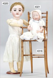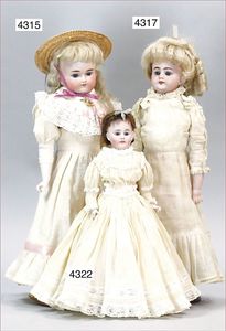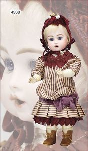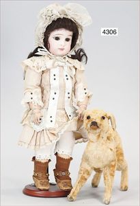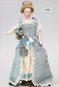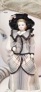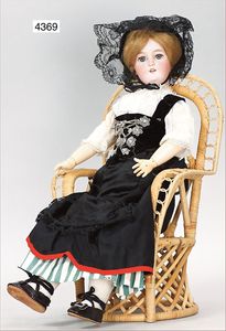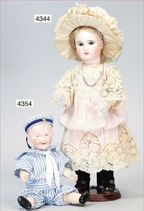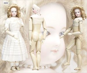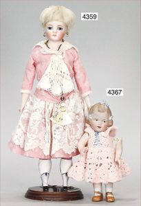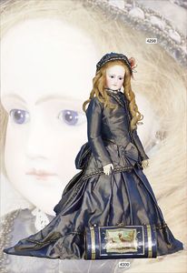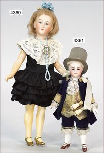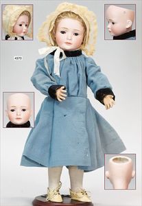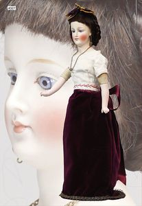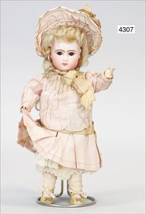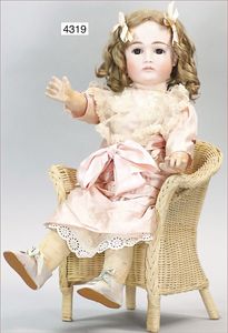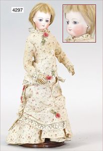 SIMON & HALBIG 1159, gemarkt S & H 6, Biskuitporzellankopf-Puppe, 48 cm, Kurbelkopf, blaue Schlafaugen, off. Mund, oben Zähne, Kinngrübchen, durchst. Ohren, Orig.-Echthaarperücke, alter Korkdeckel, schöner schlanker taillierter Gliedekrörper, mit leicht anmodelliertem kindlichem Busen, Orig.-Kleidung und -Unterkleidung, Körper gemarkt mit etiket Bebe Jumeau, Diplome d´Honneur, unbespielter Orig.-Zust.