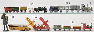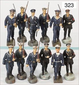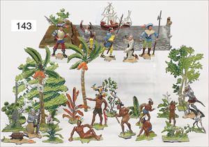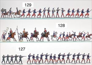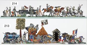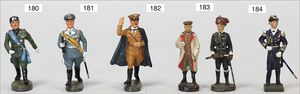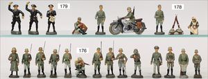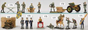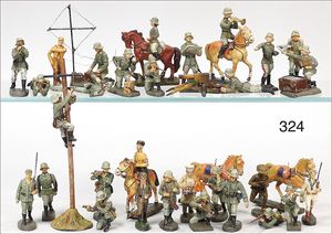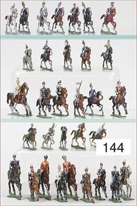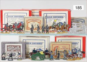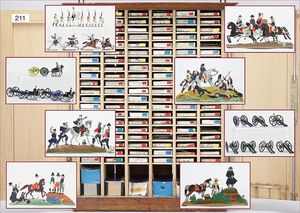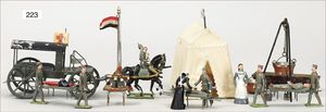 gr. Konv. Zinnfiguren, meist um 1900, flach, 3 cm, insgesamt ca. 2479 Teile, meist Heinrichsen Nürnberg, 50 Teile Artillerie (Kanonen, Pferdegespanne, Zugwagen, Munitionswagen), 5 Gruppendarstellungen, ca. 522 Reiter, 16 Pferde, ca. 1855 Fußsoldaten, 1 Kanonenfeuer, Darstellung der Soldaten aus der Epoche Napoleons, Freiheitskriege, darunter Napoleon, Kaiser von Österreich, Zar von Russland, König von Preußen, uvm., wohl Darstellung der Völkerschlacht bei Leipzig, 1813, genaue Auflistung der Figuren liegt vor, dazu kl. 4-seitige Broschüre "Die Schlacht bei Leipzig", im Jahr 1813, Beschreibung der Schlacht vom 14. bis zum 18. Oktober 1813, dazu passend angefertigter Schrank