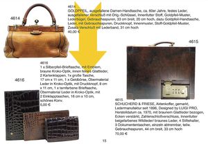 GOLDPFEIL 1 ausgefallene Damenhandtasche, markiert Modell Goldpfeil, Farbe Tan, ca. 60er Jahre, festes Leder, ausgefallener Verschluß mit Orig.- Schlüssel, Innenfutter Stoff, Orig.- Goldpfeilmuster, Lederhenkel, Gebrauchsspuren, 33 cm breit, 20 cm hoch, dazu 1 Goldpfeilhandtasche, Leder mit Gebrauchsspuren, Druckknopf, Innenmuster, Stoff-Goldpfeilmuster, Zusatz-Verschluß mit Lederband, 31 cm hoch