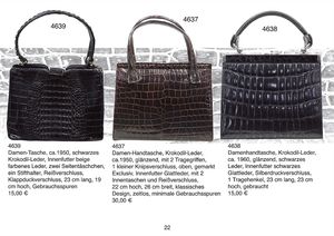 Damenhafte Krokodil-Lederhandtasche, mit IRV (Internationaler Reptilienverband), Stempel und Unterlagen, Drehverschluß vorne, 1 Tragehenkel mit Goldscharnieren, 2 gr. Füllfächer, Seitentaschen, edeles klassisches Design, 28 cm breit, 21 cm hoch, kl. Gebrauchsspuren im Leder-Innenfutter