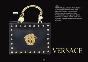 VERSACE ausgefallene Abendtasche, dunkelblaues weiches Leder, mittig Medousa-Emblem, gold, goldener Kettenträger, innen glattes Leder, 1 Seitentasche, innen gemarkt Gianni Versace, 27 cmbreit, 21 cm hoch, dazu originaler Versace Aufbewahrungsbeutel