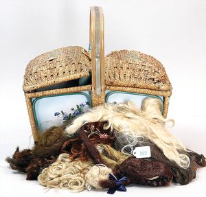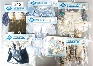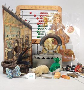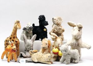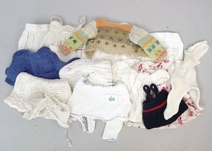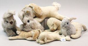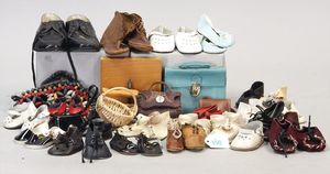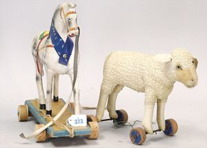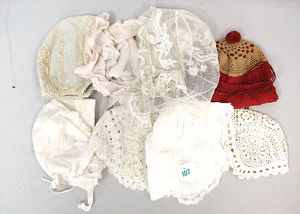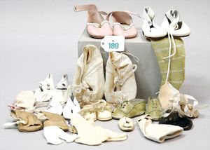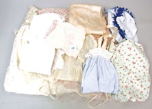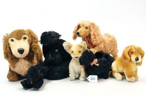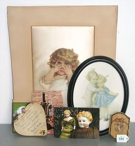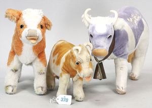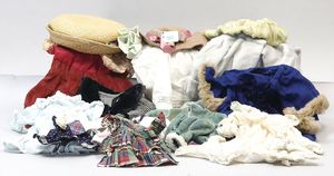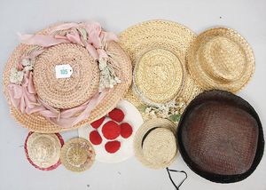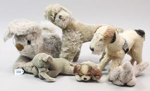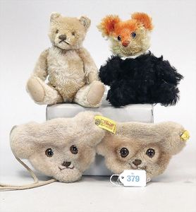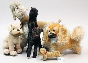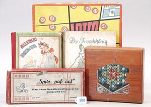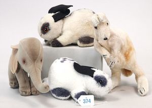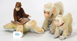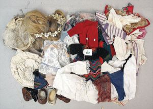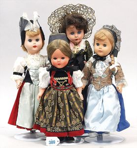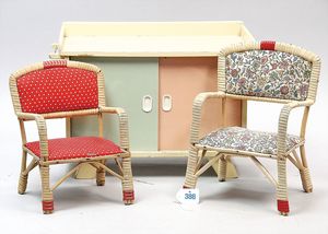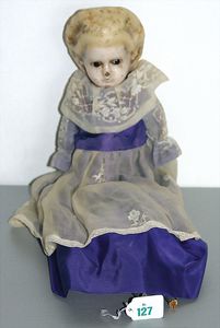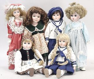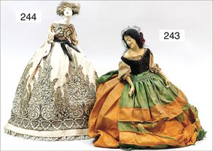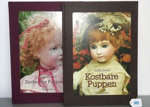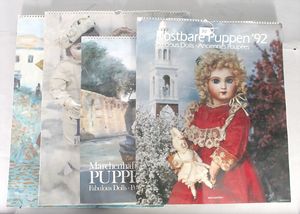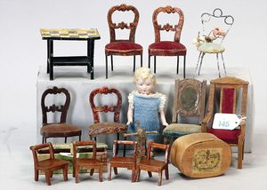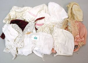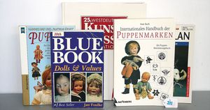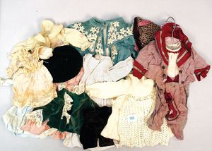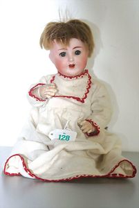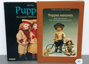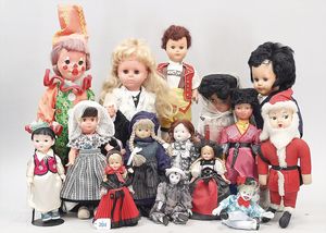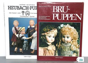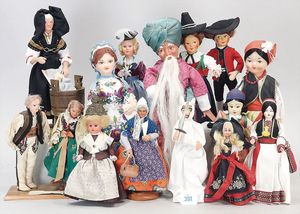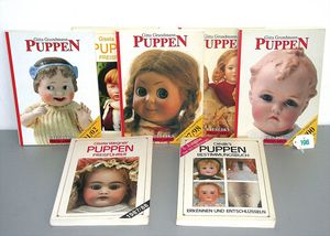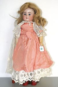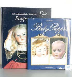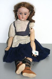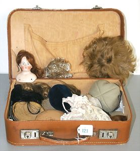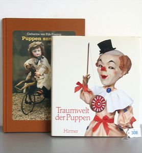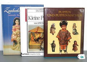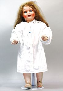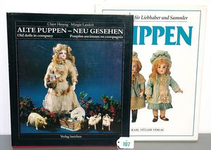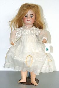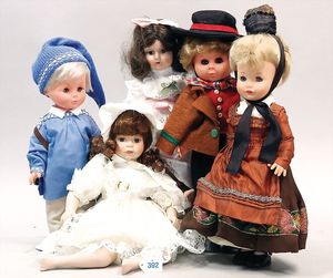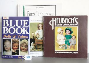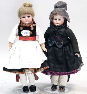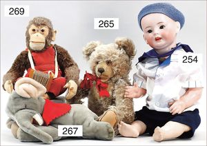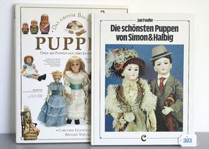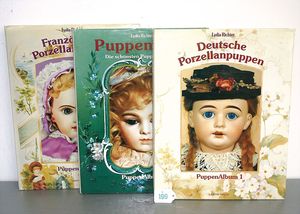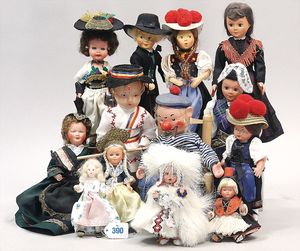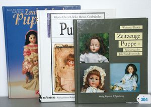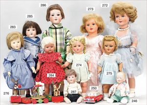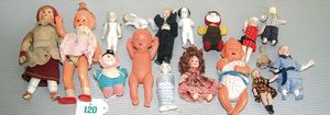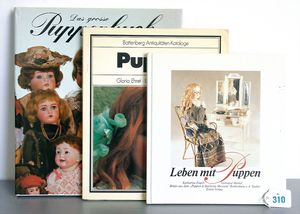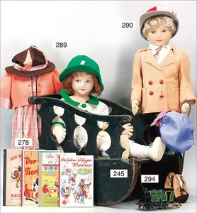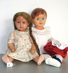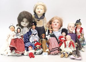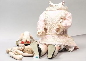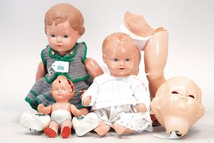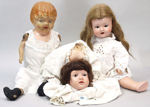 3 Puppen, Masse-Puppe gemarkt Sonneberg 2966, braune Schlafaugen, off. Mund, Zähne, Echthaarperücke, einfacher Masse-Stehkörper, 57 cm, dazu Pappmaché-Brustblattkopf-Puppe, gemarkt AM Doll.Co, modellierte Frisur, gemalte Augen, auf Stoffkörper, Holzwolle gestopft, Masse-Arme, 65 cm, Celluloid-Puppe, Kopf weggebrochen, liegt lose bei, braune Schlafaugen, off. Mund, 2 Zähne oben, Mohairperücke, Masse-Stehbabykörper, ca. 55 cm