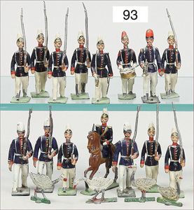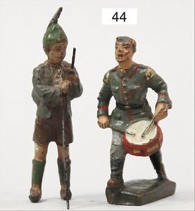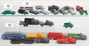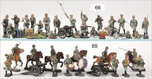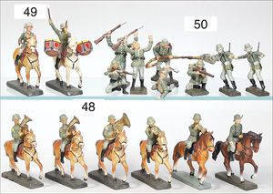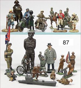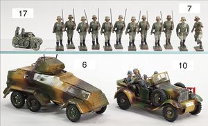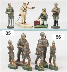 ELASTOLIN 2. Weltkrieg, 7,5 cm, Masse, Reichsarbeitsdienst, Mann mit Schippe, Zust. 3-, 1 Pilot Rotorblatt tragend, wohl farblich überarbeitet, 9 Figuren Elastolin und Lineol, 2 Verwundete, 2 Männer mit Kelle, Figuren Munitionskisten tragend, Mann mit Granate, Zust. 2-3, dazu 1 Wärterhäusschen, guter Zust.