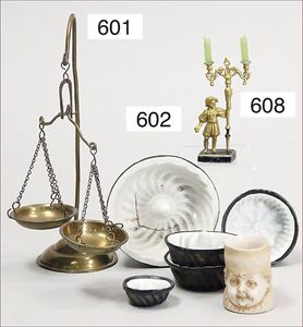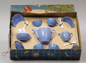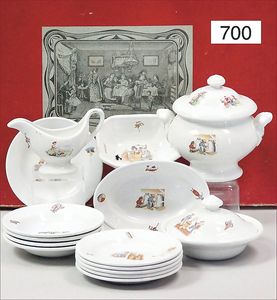 Kinder-Speiseservice, um 1900, Motiv Max und Moritz, 6 flache und tiefe Teller, Durchm. 11 cm, Suppenschüssel, Sauciere, 2 Anbieteschalen, 1 Deckelschale, Orig.-Kart., mit zeitgenössischem Deckbild, ausgefallen