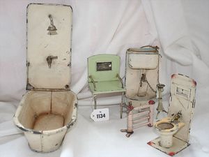 Konv. Badezimmereinrichtung, Toilette, Badewanne, 2 Waschbecken, Waschtisch, Heizkörper, alles stark bespielt, Kleinteile fehlen, Lackabplatzer