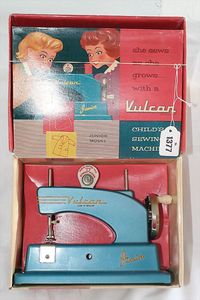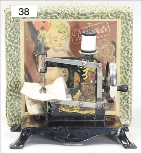 Kinder-Nähmaschine, gemarkt Adler Casige, mit Märchenmotiv, lithogr.(Hänsel & Gretel), mit Anleitung, im Orig.-Kart.