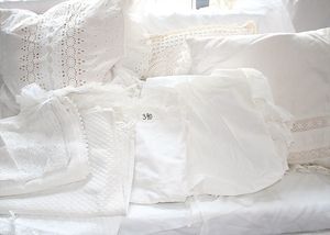 Konv. Kinderwagen-Steckkissen mit Baumwollspitze, dazu 2 Kissen und passende Decke für Stubenwagen, Baumwollspitze, Kissenbezüge, teilw. Alt