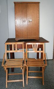 Kinder-Spielschrank, 2-türig, mit einigen Stoffresten, 66 cm hoch, dazu 1 Tisch mit Schubladen, Tischhöhe 55 cm und 2 Kinderklappstühle