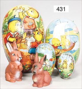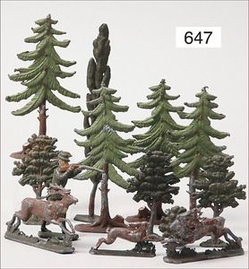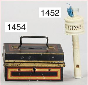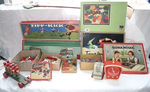 Fundkiste, u.a. ca. 40 Margarine-Figuren, einige frühe Murmeln, kleine Registrierkasse, das Spiel "Fang den Hut", "Irrgarten", "Gloria", "Mosaik", Tippkick, ein Holzziehspiel, Traffokleinteile