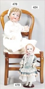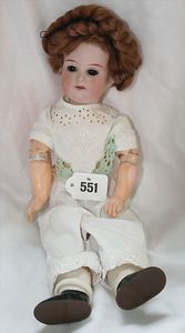 ARMAND MARSEILLE AM 390, braune, fest eingesetzte Glasaugen, off. Mund, Zähne, Kopf unschön geklebt, Wollperücke auf Masse Gliederkörper, mit festen Handgelenken, stärker bespielt, 28 cm