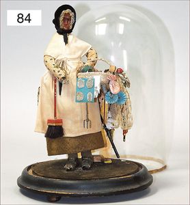 Wachsfigur, alte Dame, Krämersfrau, mit Näh-Utensilien, ca. 26 cm, unter einem Glassturz (Glas geklebt)