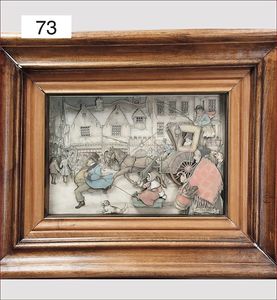 Straßenszene, Papier, ausgeschnitten in 3D-Optik, mit Namensschild Anton Pieck, Alter ?, Maße ca. 33 x 22 cm, in Holzrahmen, etwas verzogen