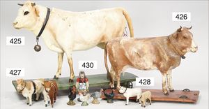 frühe Kuh, vor 1900, Gr. 42/34 cm, Velourbezug, Glasaugen, auf Holzbrett montiert, mit Speichenrädern, Glocke und Stimme, außergewöhnliche Größe, sehr guter Zust.