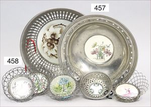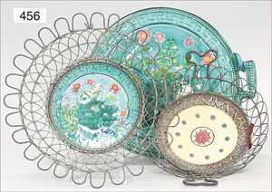 2x Obstkorb mit Keramikboden, Durchmesser 20 cm, 1x florales Muster, wohl Villeroy & Boch, gem. 126, dazu passender Teller, Durchmesser 24,5 cm, gem. 151, kleine Glasurabplatzer am Boden