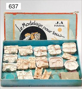 franz. Modellierkasten mit Gipsgussformen, im Orig.-Kart., Aufschrift: Le Modellage pour tous, gem. J.A. Paris, Deckel stellenw. Eingerissen