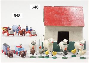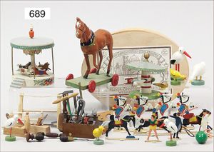 2x Erzgebirge Karrussel, bespielt, Höhe 6,5 und 9 cm, Pappmaché-Pferd auf Holzrädern, einige Hühner und Gänse, Zinnfiguren, handbemalt, neu und Konv. Miniaturwerkzeug für eine Schreinerei, neuer