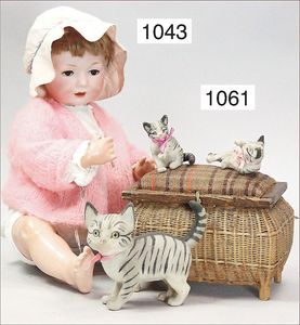 3 Pappmaché-Katzen, filzbezogen, Mutterkatze wohl Candy-Container, Kopf abnehmbar, Länge 16 cm, 2 Jungkatzen, dazu 1 alter Nähkorb