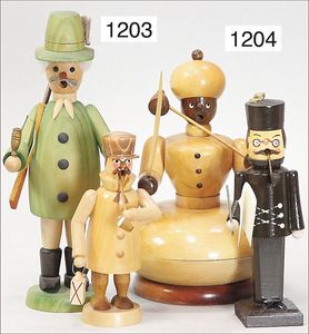 2 holzgeschnitzte Figuren, 1x Mohr, Finger der re. Hand weggebrochen, 23 cm, 1x Flötenspieler, 27 cm, altersbed. Farbabplatzer