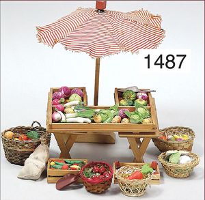 Marktstand, Holz, Höhe 26 cm, Breite 24 cm, Tiefe 14 cm, mit Rosenbildchen dekoriert, dazu 1 Engelsschule, Holz, neu
